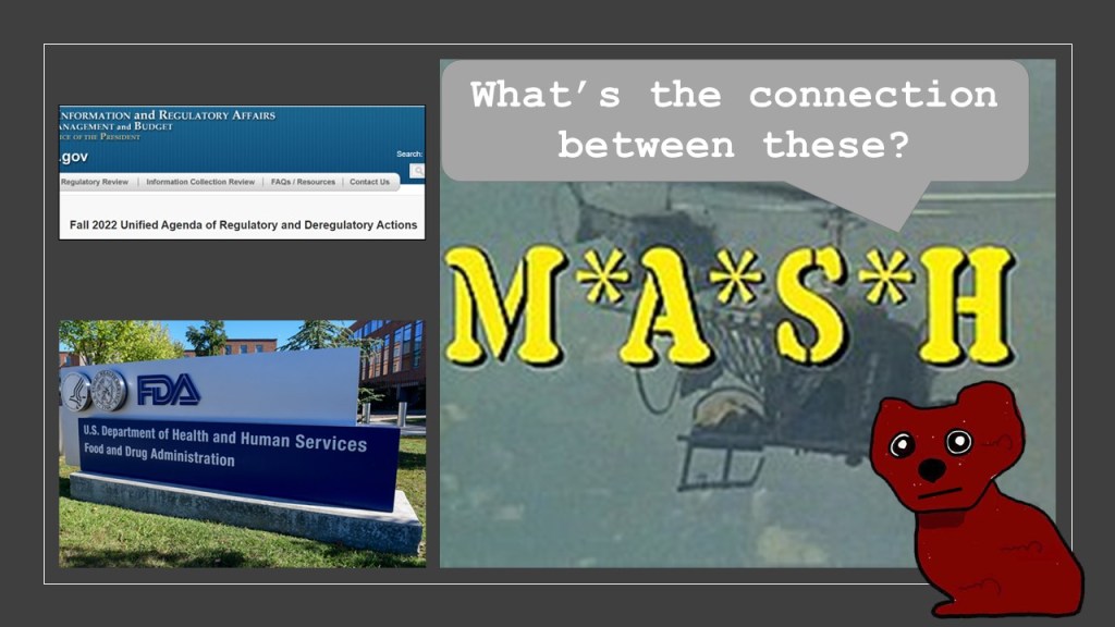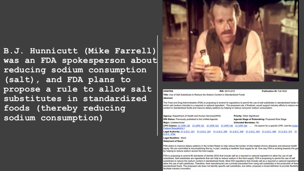 A Unifying Connection between M*A*S*H, FDA, and the Unified Agenda Posted by John Johnson on February 28, 2023 There’s a CPSC and M*A*S*H connection too! The Links: Sodium with Mike Farrell PSA M*A*S*H on Gasoline Safety Unified Agenda, Use of Salt Substitutes to Reduce the Sodium Content in Standardized Foods Share this: Click to share on X (Opens in new window) X Click to share on Facebook (Opens in new window) Facebook Like Loading... Related