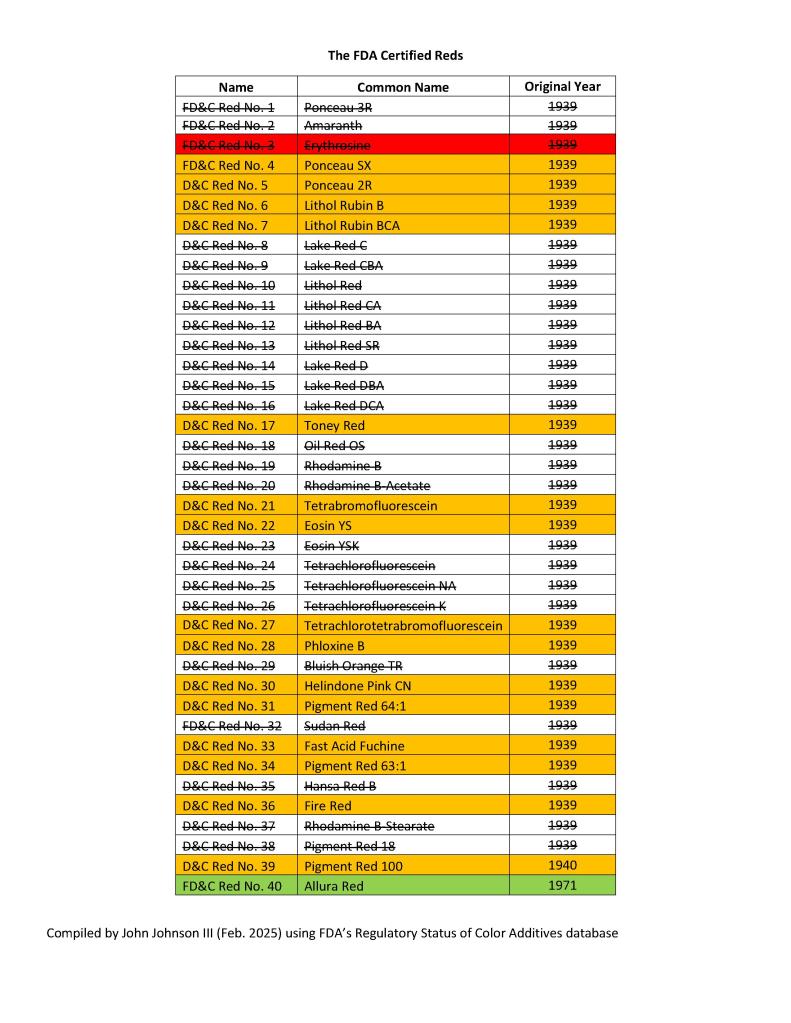 With the Color Additive Amendments of 1960, FDA conducted a re-review of all the colorants and we ultimately get to the current list of reds, which has been whittled down from the original list. Since FDA never renamed anything, we get Red 3 and Red 40 with no food red colorants remaining in the middle.